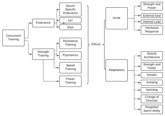 However, the impact of CT is not limited to the potential physiological or physical adaptations (or the chronic effects derived from a specific period in which a stimulus is provided). CT also produces a given acute or transitory effect in which the stimulus temporarily changes physiological or physical dimensions. While some reviews have addressed the effects of CT in performance outcomes and physiological changes [20,21] in different sports [22,23,24], a characterization of training protocols in soccer is lacking. For instance, it was found in non-soccer athletes that power is the most important variable that can be affected by CT [20]. Additionally, it was found that high volume, moderate, continuous and frequent endurance training negatively affect the resistance training-induced adaptations, probably by inhibition of the Protein kinase B—mammalian target of rapamycin pathway activation of the adenosine monophosphate-activated protein kinase; on the other hand, it was found that short bouts of high-intensity interval training or sprint interval training could minimize the negative effects of concurrent training [21].