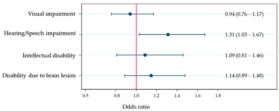 When analyses were performed based on the ability to walk independently, the rate of participation in regular physical activity was significantly higher in the hearing/speech impairment group (OR = 1.43, 95% CI = 1.11–1.84, p = 0.005) than in the physical disability group. However, there were no significant differences between the physical disability group and the visual impairment, intellectual disability, and brain lesion-related disability groups (p > 0.05; Table 4).