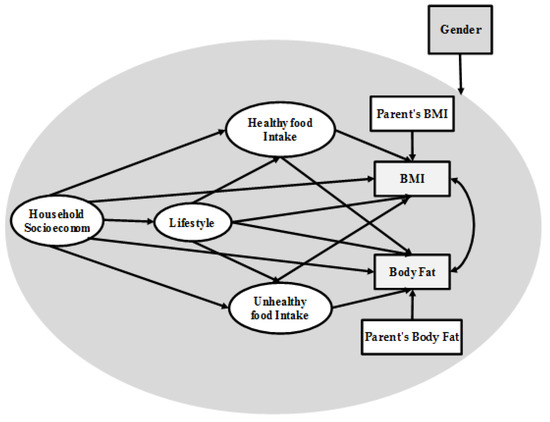 Finally, parents’ BMI is another measurement variable considered in some obesity modeling with [32,33] and without the SEM technique [34,35]. In this study, we involved parent’s BMI and parents’ body fat as the two control variables in our research framework.