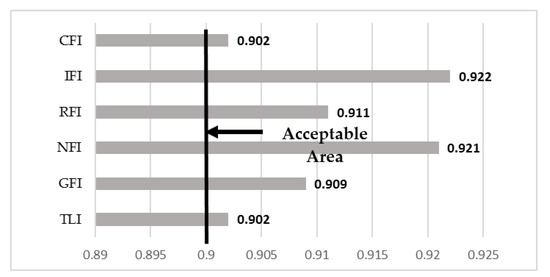 Some statistical indices are frequently used in assessing model fit within SEM and these include GFI [goodness-of-fit index], NFI [normed fit index], IFI [incremental fit index], RFI [relative fit index], TLI [Tucker Lewis index] and CFI [comparative fit index]. Figure 2 shows the results for model fitting indices based on the SEM approach. The values of all indices were within acceptable range; therefore, the present framework as presented in Figure 1 was deemed a good fit for our data.