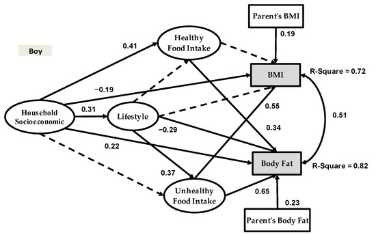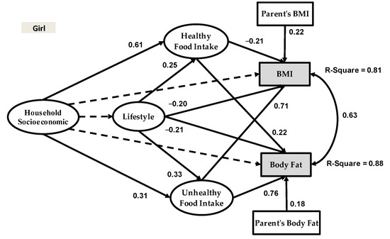 Results of the present study are consistent with previous literature that has examined the relationship between household socioeconomic status and BMI and body fat [53,54,55]. However, diverging from the previous studies that omitted gender in their models, the results of the present study suggested that gender was a significant moderator in the adolescent obesity modeling equation. The present study further provides evidence that the relationship between household socioeconomic status and BMI and body fat was statistically significant for the adolescent boy obesity model; however, the same relationship did not hold true for the adolescent girl obesity model. In the adolescent girl obesity model, household socioeconomic status had an indirect effect on BMI and body fat through healthy food intake and unhealthy food intake, respectively. The data also suggested that parental education, household income and pocket money for adolescent boys are the significant variables in the household socioeconomic status latent variable (Table 6), impacting their BMI and body fat. Overall, these findings supported our hypothesis that gender might be a significant moderator in adolescent obesity modeling.