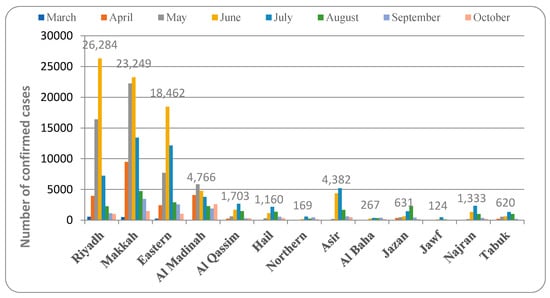 Figure 1 depicts the pattern of COVID-19 distribution in various provinces. Riyadh province recorded cases beginning in March 2020. The peak increase in cases was detected in June 2020, and from then on, the number of confirmed cases started to decline. The total percentage of COVID-19 detected in this province was 23%. The pattern of spread of COVID-19 in Makkah province was active in March 2020, increasing in April and May and reaching a peak in June, then showing a slow decline (30.7% of total cases). Similarly, in the Eastern province, the first case was detected in March 2020 and the number peaked in June and then declined. The spread of COVID-19 started in the month of March 2020 and peaked in May and then showed a slow decrease in the number of confirmed cases (18.6% of total cases).