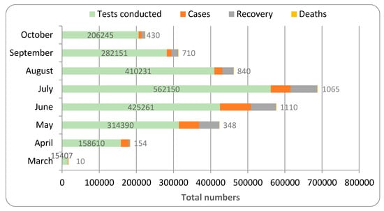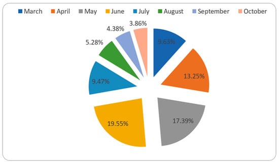 The first case of COVID-19 was discovered in March, and the percentage of confirmed COVID-19 cases calculated from the total number of tests in this month was 9.63%. This rate increased faster and reached its peak in June (19.55%). The rate then began to fall, and extensive testing was conducted, yielding the lowest detected percentage of confirmed cases (3.86%) (Figure 2).