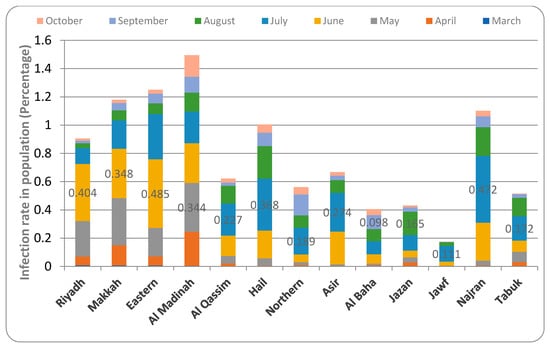 The rate of infection in Saudi Arabia indicated that all the provinces recorded COVID-19 cases in the month of March except Hail and Jawf. Riyadh province had the highest infection rate (0.008% of the population) in this month, followed by Makkah province (0.007%), Eastern province (0.006%), and Al-Qassim (0.0004%). The infection rate gradually increased and reached peaks in the month of May (Al Madinah—0.344%), June (Riyadh—0.404%, Makkah—0.348%, Eastern—0.485%), July (Al-Qassim—0.227%, Hail—0.368%, Northern borders—0.186%, Asir—0.274%, Jawf—0.111%, Najran—0.472% and Tabuk—0.172%), August (Jazan—0.165%), and September (Al Baha—0.098%). Since these months, the COVID-19 infection rate has gradually decreased in all provinces of the country. Al Madinah province had the highest infection rate (0.15%) in October, followed by Hail (0.05%), Najran (0.03%), and Jawf (0.0007%) (Figure 3).