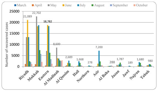 The data also showed that the provinces with the highest rate of infection also had the highest rate of recovery, either in the same month or the month after (Figure 1, Figure 2, Figure 3, Figure 4, Figure 5, Figure 6 and Figure 7). The rate of recovery in the kingdom has now reached close to 97%. Several factors have been attributed to the recovery from the COVID-19 infection. The first and most important factor is the extent of the viral load carried by the susceptible individual. The compulsion to use a facemask, frequent hand sanitization, and maintaining social distancing have all been effectively implemented by the government authorities (https://www.moh.gov.sa, accessed on 12 June 2021).