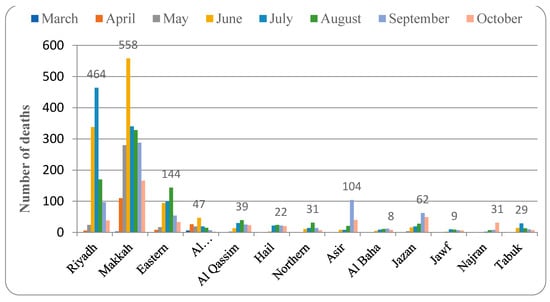 The data for the mortality rate from COVID-19 infection are summarized in Figure 5. Riyadh province reported mortality in the month of March 2020, and this peaked in July (total mortality rate of 1.9%). Makkah province followed a similar pattern, with mortality beginning in March but peaking in June (mortality rate 2.6%). The mortality in the Eastern province was found in April and reported its peak death rate in August (mortality rate of 1.9%). Al Madinah province reported the first mortality in March, and the peak rate was found in June (1.6% of mortality). The first death from COVID-19 was reported in April in the Al Qassim province, and the highest mortality rate was found in August (mortality rate of 1.8%).