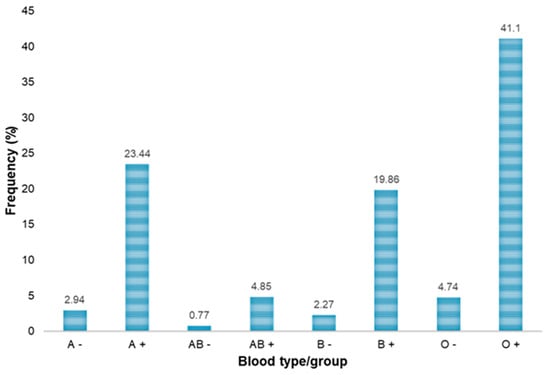 - Bashwari, L.A.; Al-Mulhim, A.A.; Ahmad, M.S.; Ahmed, M.A. Frequency of ABO blood groups in the Eastern region of Saudi Arabia. Saudi Med. J. 2001, 22, 1008–1012. [Google Scholar]