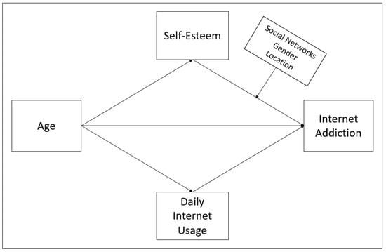 We tried to understand the mediation of self-esteem and daily internet usage in the association between age and internet addiction within the study. Additionally, the moderation roles of gender, social networks, and location in this relationship were examined. As a result of the analyzes, the hypotheses, H1, H2, and H3 were accepted. Sociodemographic data were used as control variables while examining the relationship between independent and dependent variables. We found that as the self-esteem levels of the participants increased, their internet addiction levels decreased significantly. Similarly, some studies revealed an inverse relationship between internet addiction and self-esteem [,,,]. When the literature was examined, we found studies in which internet addiction decreases as self-esteem increases [,,,]. This situation shows that the two variables are highly correlated with each other. With the increase in self-esteem, there is an increase in the positive emotions attributed to the individual. When the studies on the relationship between internet addiction and self-esteem were examined, Koch and Pratelli stated that individuals with low self-esteem spend more time on the internet and reach addiction []. Armstrong et al. supported this finding and revealed that individuals with low self-esteem use the internet more, and self-esteem is an essential factor in determining addiction criteria []. Niemz et al. similarly stated that individuals with low self-esteem have problematic internet use []. Berardis et al. found that adolescents’ low self-esteem could cause internet addiction []. Contrary to these studies, Yıldız found a positive relationship between self-esteem and internet addiction in a study conducted with 200 university students in Istanbul []. Eroğlu and Bayraktar could not find a meaningful relationship between self-esteem and internet addiction in their research with 120 people living in Istanbul []. We understood from studies that individuals with low self-esteem try to meet their needs for being accepted and valued by society over the internet.