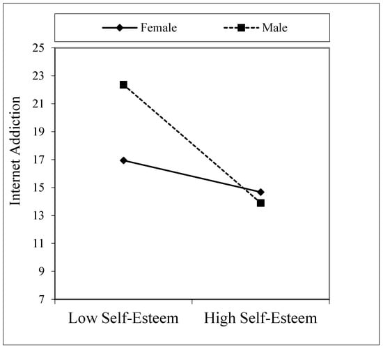 Moderation analyses are shown in Table 5 in three different models, as Model 1, 2, and 3. According to the results hypothesis, H3 was accepted. Table 5, Model 1, shows the existing sociodemographic variables, self-esteem, and gender interaction variables. The effect of the self-esteem X gender interaction variable on internet addiction was significant (B = −3.02, p < 0.001). According to this result, there were differences in the effect of self-esteem on internet addiction according to gender. As seen in Figure 2, as self-esteem increased, males’ internet addiction levels decreased faster than females’.
