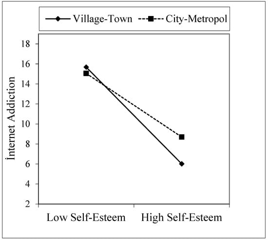 Table 5, Model 2 shows that the interaction variable of self-esteem and location was included in the existing sociodemographic variables. The effect of the self-esteem X location interaction variable on internet addiction was significant (B = 3.69, p < 0.001). Accordingly, there was a statistically significant difference in the effect of self-esteem on internet addiction between village/town and city/metropolitan residents. According to the graphic depicted in Figure 3, as self-esteem increased, the level of internet addiction decreased faster in those living in a village/town area than those living in a metropolitan area.