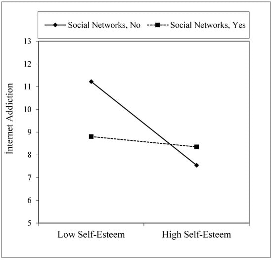 As seen in Table 5, Model 3, we found the effect of self-esteem X for social networks interaction variable on the internet addiction dependent variable to be significant (B = 1.86, p < 0.05). Accordingly, there was a statistically significant difference in the effect of self-esteem on internet addiction between those who use the internet to reach social networks and those who use it for other purposes. As shown in Figure 4, it was understood that as the self-esteem of those who use the internet to reach social networks increased, internet addiction decreased much slower than those who use it for other purposes. In other words, while the self-esteem of those who use the internet for social networks increases, internet addiction becomes more resistant to decreasing compared with those who use it for other purposes.