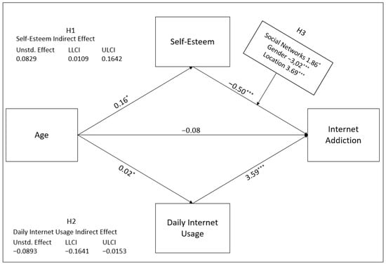 After performing the direct, indirect, and moderation analysis of the conceptual research model in Figure 2, the results are shown in Figure 5 below. The coefficients giving the direct effect between each factor are shown between those two factors. The H1 hypothesis shows the mediating effect of self-esteem in the effect of age on internet addiction. The H2 hypothesis shows the mediating effect of daily internet usage in the effect of age on internet addiction. The H3 hypothesis shows the moderation effects of social networks, gender, and location in the effect of self-esteem on internet addiction.