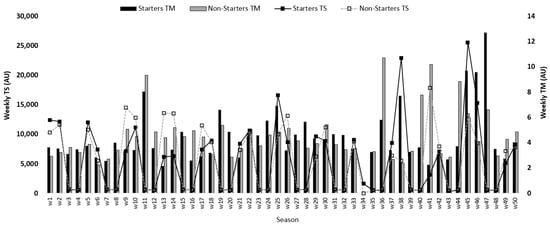 Figure 1 shows the average weekly variations of the TM and the TS across the full-season for starter and non-starter players. The highest TS occurred in week 45 for starters and for non-starters occurred in week 41. The lowest TS was verified in week 34 for both starters and non-starters. About the TM, the highest occurred in week 47 for starters and for non-starters occurred in week 36. The lowest TM was verified in week 34 for both starters and non-starters.