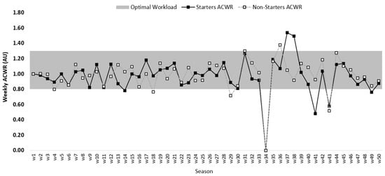 Figure 2 shows the average weekly variations regarding the ACWR for the full season for starters and non-starters. In general, the values remained in the optimal zone until week 34. The lowest values for starters and non-starters were recorded at week 34. After this week, the values for starters were higher and remained outside the optimal zone. In the last 5 weeks of the season, they stabilized in the optimal zone for starters and non-starters.