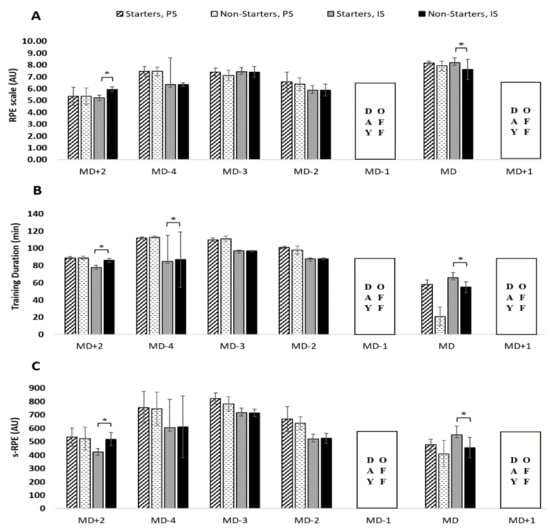 Regarding RPE, higher values were found for the full-squad during the pre-season (M1) when compared to other mesocycles, which is in line with several authors [,,]. During this period, a higher workload was achieved to prepare players for the competitive phase. However, most mesocycles have similar RPE values, which cause a tendency to flatten out differences in RPE. Nevertheless, it seems that varying short term workload according to the different developmental ages benefits players’ physical performances []. In the present study, the variations that occurred in the microcycles did not have an expression in the total workload of the mesocycle, justifying the reduced variations observed. For instance, Wrigley et al. [] presented higher RPE values during training sessions than in matches for U14, 16, and 18, and eventually, these variations may have occurred and contributed to the results recorded in the microcycles and mesocycles of the present study. The comparison of RPE between starters and non-starters showed significant differences in MD+2 and MD (Figure 3A). This result is in line with a previous study []. In fact, MD+2 is very important for the recovery of the team (namely, the players who were starters) and to prepare players for the next training sessions with higher-intensity (MD-4 and MD-3).