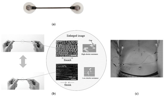A stretch sensor, as shown in Figure 1, was used to capture patient respiration. This was developed at Yamaha Corporation and Shizuoka University [17,18]. It is composed of multiwall carbon nanotubes, shown as the black part in Figure 1a, and can stretch itself to up to 200% of its length, as shown in Figure 1b. The frosted white parts, made of plastic, are fixed onto a patient’s skin. The metal parts were connected to the electric cables to measure the stretch part’s electrical resistance. The sensor linearly reported the displacement between its two edges as resistance variation with very small hysteresis. One edge was placed with a biocompatible adhesion sheet onto the skin at the 6th rib and the other was at the 8th rib, as shown in Figure 1c. The sensor showed a resistance difference for following the 6th to 8th intercostal distance which reveals a correlation with respiration phases. We collected respiration signals with the 6th to 8th rib distance under the supposition that inter-rib distance could be linear with respect to lung volumes. Data samplings for respiratory signals were taken at 10 Hz frequency.