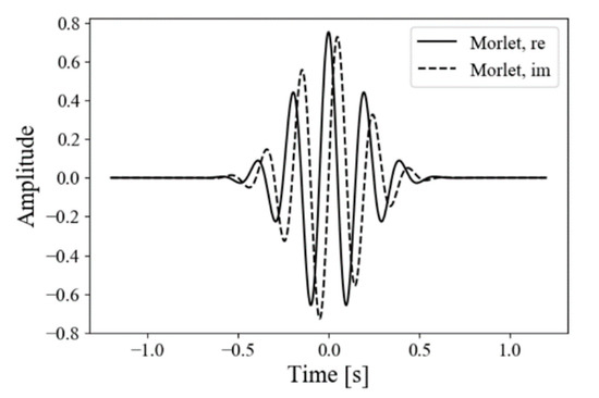 Complex-valued wavelet transform (CWT) [18] processes signals of intercostal distance. It converts the original signals to time-varying representation in the frequency domain. The mother wavelet was a Morlet kernel function as shown in Figure 2, which consisted of a plane wave modulated with a Gaussian: