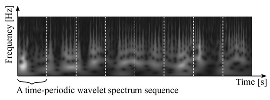 Respiratory signals might repetitively vary with arbitrary time duration. A normal respiratory signal repeats around every 4–5 s [19]. A repetitive signal can also appear around every 40–50 s [9] or at a longer interval, particularly in low-functional respiration according to empirical knowledge in the clinic. This leads to a signal-processing strategy that is the correlation of time-periodic spectral series being able to distinguish normal and low-functional respirations. Thus, our implementation began to segment the spectral time sequence to periodic datasets with arbitrary time duration, as shown in Figure 3. Let be an arbitrary time duration of periodic data ; it can be denoted as