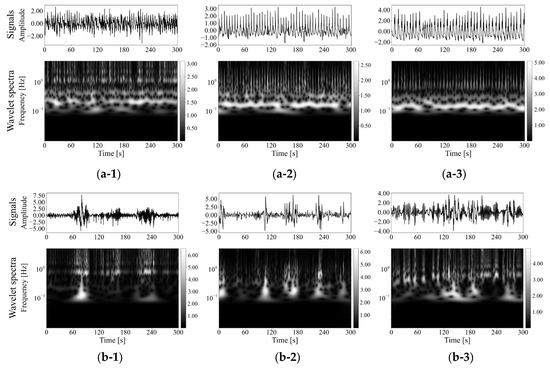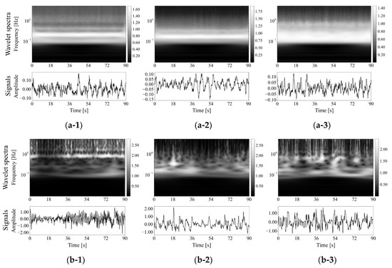 Original respiratory signals shown at the top and their wavelet spectra shown at the bottom: (a) Normal respiration phases and (b) Low function phases. The pair of each subnumber, 1, 2, or 3, means of the same patient but different respiratory conditions of (a,b).