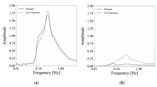 Figure 4 shows normal conditions’ stable wavelet spectra over time compared with those of low-functional respiration. The peak of the wavelet-spectrum distribution for the frequency axis appeared around 0.2 Hz, which was at a 5 s interval of respiration. The spectrum drifted to higher frequencies in the wavelet spectra of low-functional respiration. Over-time averaging highlighted such differences between the spectra of normal and low-functional conditions are shown in Figure 5. In low-functional respiration, repetitive signal patterns with a 60–80 s interval appeared weakly but not obviously. The temporal variance of spectral distribution appeared stronger in low-functional respiration than that in normal respiration.