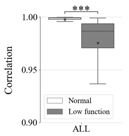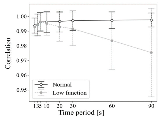 Correlation coefficients were given between each time-periodic wavelet-spectrum sequence and their average sequence, with respect to time duration. The time duration of data periods were each of 1, 3, 5, 10, 20, 30, 60, and 90 s. It was tested and compared between normal and low-functional respiratory conditions. In addition, it was done for each inpatient and among-patient with a 90-s time duration. The patients were 19 as introduced in Section 3.1. The correlation values were tested with Welch’s t-test. In addition, entire data collecting time-periodic data among all the patients were tested with the same statistics. Furthermore, a receiver-operating-characteristic (ROC) curve was given in the detection of low-functional respiration. It was given by increasing the threshold of normal to low-functional classification from 0.8 to 1.0 with 0.001 ticks.