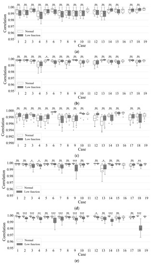 Figure 7 shows correlation coefficients among wavelet spectrum periods with respect to the period’s time durations, which were 1, 3, 5, 10, 20, 30, 60, or 90 s. Results showed that the correlation of normal respiration was higher than the correlation of low functional respiration was in most cases. Particularly in long time periods exceeding 10 s, a difference appeared between normal and low-functional conditions and increased as time duration became longer. Figure 8 and Figure 9 show the statistics of correlation coefficients for each normal and low-functional respiration. In Cases 11, 16, and 19, the lack of low-functional data was due to the shortness of the low-functional respiration periods. Most correlation values showed significant differences among them with Welch’s t-test in each patient’s data. The correlation values in the entire data also showed significant differences among them. Figure 10 shows the receiver operating characteristic (ROC) curve in the detection of low-functional respiration. It shows the possibility curve passing through the combinations of (0.81, 0.95) at 0.9973, (0.88, 0.88) at 0.9960, and (0.92, 0.80) at 0.9946 for (1—specificity, sensitivity) at an arbitrary threshold used in normal-to-low-functional classification.