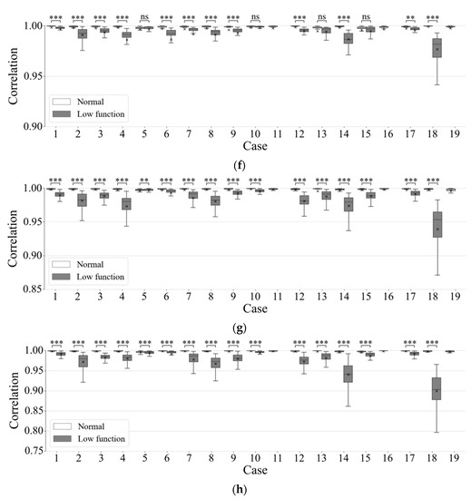 Correlation coefficients of wavelet-spectrum series with the average spectra for each patient. Time duration of wavelet-spectrum period were (a) 1, (b) 3, (c) 5, (d) 10, (e) 20, (f) 30, (g) 60, and (h) 90 s. In the figure, *, **, and *** mean statistical significances of , , and , respectively.