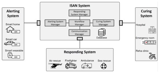 To fulfill the requirements, we propose an emergency communication platform to link data across pre- and in-hospital stages of the early rescue chain. We compose our architecture of the alerting, responding, and curing system, and the ISAN core system (Figure 1). The alerting system represents the ICT system at the accident site. It collects relevant data and generates an ISAN-based alert upon an accident. The responding system is represented by the first responder’s ICT system and refers to the rescue team tuned upon an event. The curing system refers to ICT systems in hospitals and emergency rooms. As the coordinator of the isolated ICT systems, the ISAN system monitors the ICT system status, responds to alerts, and establishes secure platform-based communication channels between the systems.