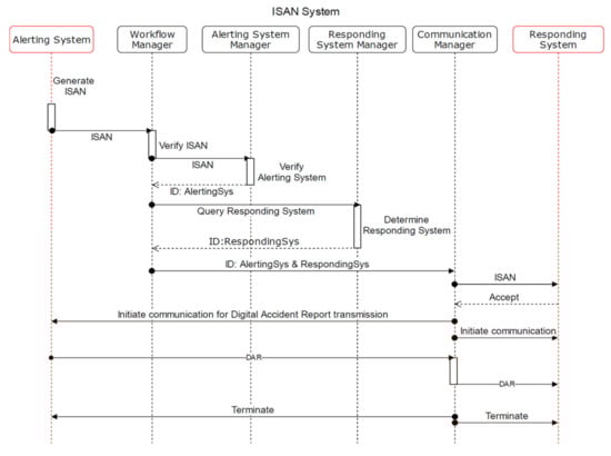 The ISAN system may also serve as a complement to the NG112. The NG112 platforms and reference architectures are designed for human-to-human communication by using VoIP technologies. In contrast, the ISAN system is designed for M2M communication only. Furthermore, the NG112 architecture considers emergency call centers only. In contrast, the proposed ISAN system considers all ICT systems involved in a rescue operation [].