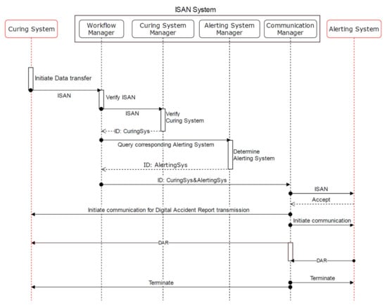 There is related work on accident data acquisition in smart environments [,]. In contrast, the ISAN communication platform intends to establish secured data transfer between authorized agents. According to the ISAN paradigm, the data linkage key is generated in place, i.e., at the time of the event. This increases the accuracy of accident data matching as compared to the typical approaches, which rely on keys that are generated afterwards or centralized [,].