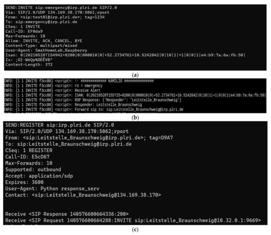 We set up a virtual machine to simulate the responding system. We implemented the responding systems according to the rescue team stations in the city of Braunschweig, Germany. We registered all to the ISAN system (alerting system ID: EF0da9 and responding system ID: E5cD67). In the event, the alerting system, i.e., SmartHomeLab_Raspberry generates an ISAN and sends it to the ISAN system (Figure 5a). The ISAN system processes the token and extracts the event’s location and the responsible control station (German: Leitstelle) (Figure 5b). The responding system accepts the invitation and acknowledges the availability to start the rescue operation (Figure 5c).