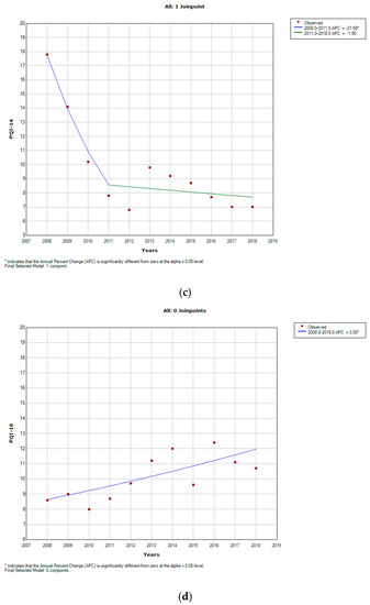 Joinpoint regression analyses reporting annual age and gender standardized rates and average annual percentage change (AAPC) observed for diabetes-related preventable hospitalization from 2008 to 2018. (a) PQI-01; (b) PQI-03; (c) PQI-14; (d) PQI-16; * Indicates that the APC is significantly different from zero at the alpha = 0.05 level.