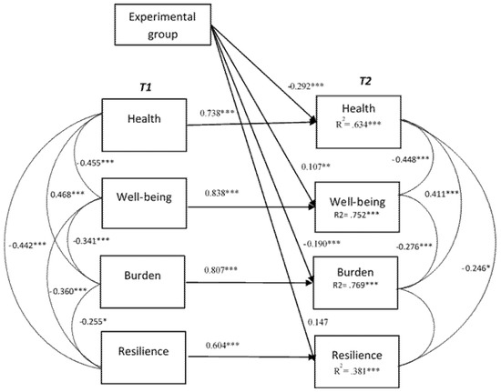 Cross-lagged relationships between health, well-being, burden and resilience at pre-test (T1) and post-test (T2). Model fit: χ2 (8) = 7.179, p = 0.51, RMSEA = 0.00, CFI = 1.00, SRMR = 0.05. * Correlation is significant at level 0.05; ** Correlation is significant at level 0.01; *** Correlation is significant at level 0.001.