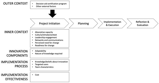 We canvassed the implementation science literature for conceptual models that focused on innovation, as the innovation itself (SDM and decision aids) is pertinent to project initiation (i.e., project definition occurs during initiation). We identified three implementation science models [17,18,19] that conceptualized “innovation” and combined them [20] to create a conceptual model for our study. As shown in Figure 1, project initiation is conceptualized by four domains: inner context, innovation components, implementation process, and implementation effectiveness. These implementation models also suggest that project initiation is influenced by the outer context (i.e., the decision aid certification program, described more below, and other external factors). Per implementation literature [11], project initiation is followed by the stages of planning, implementation and execution, and, finally, reflection and evaluation. Our study focuses only on the project initiation stage.