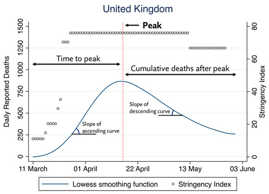 All the outcomes were derived from a smoothed mortality curve, obtained by the application of a locally weighted (Lowess) regression using a bandwidth of 0.4 on the raw daily mortality data reported by the World Health Organisation [1]. The peak of the mortality curve was defined as the point at which the first derivate of the Lowess regression line became null. Figure 1 details the derivation of each parameter from the daily mortality data, exemplified using the data from the United Kingdom.