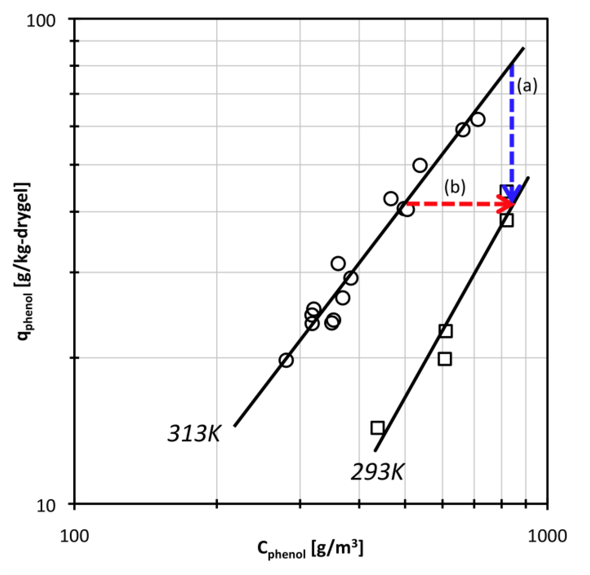 Adsorption isotherm data are shown in Figure 1. At the phenol concentrations used in this study, the phenol adsorption isotherm could be approximately expressed by a Freundlich type equation. The parameter values were estimated as K = 3.34 × 10−4, 1/N = 1.74 at 293 K and K = 1.57 × 10−2, 1/N = 1.27 at 313 K. Because there is one polyDEAA gel particle in an excess amount of phenol solution in this study, the temperature swing operation at a constant bulk phenol concentration will be as indicated by arrow (a) in Figure 1. The arrow (b) in Figure 1 shows the temperature swing operation when the amount of phenol adsorbed is kept constant. The given Freundlich type equation was used to calculate suitable phenol concentrations for swelling of DEAA gel under a constant amount of adsorbed phenol.