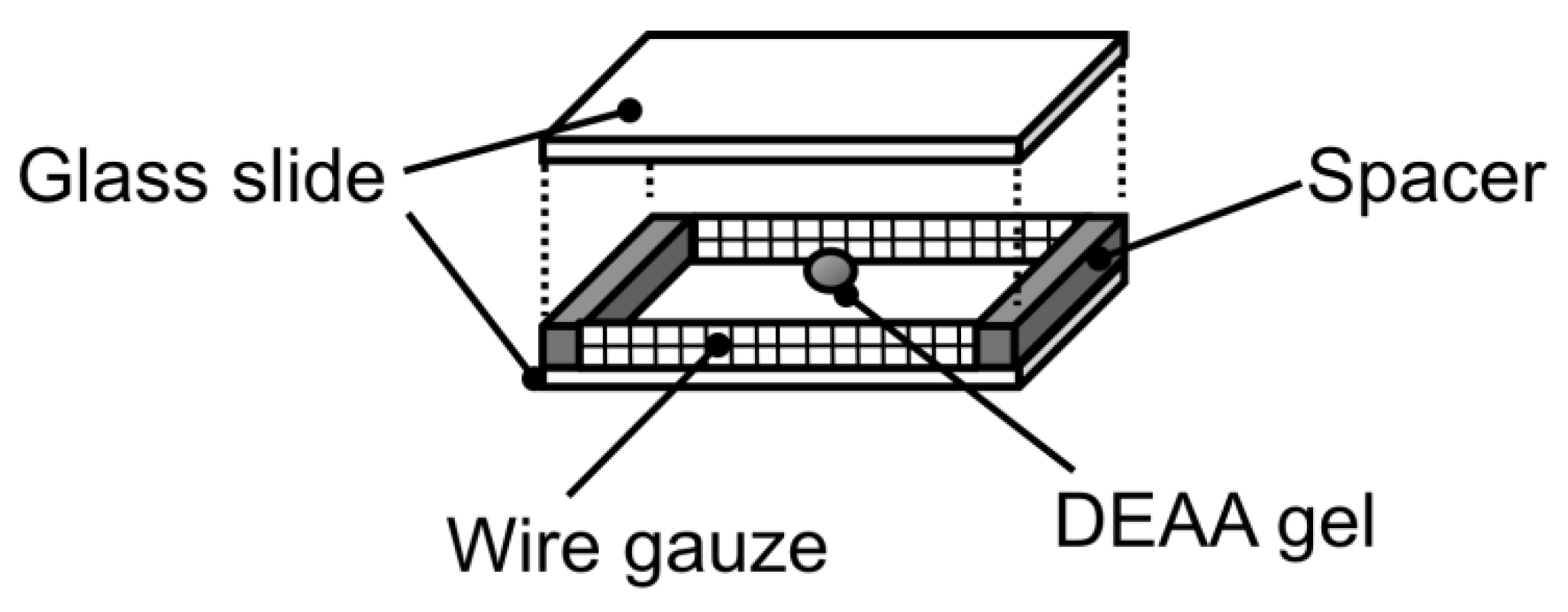 where ae, a0 and a(t) are the hydrogel characteristic length at equilibrium, initially and at time t, and τ is the relaxation time of the polymer network. When τ is smaller than time t (that is t/τ> 1), we can assume n = 1. It has been already confirmed for the DEAA gel used in this study that linear behavior was within t/τ > 0.25 in water [21]. Then we assumed n = 1, and calculated kv of polyDEAA gel by fitting the experimental data to Equation (1). The collective polymer diffusion constant D could be obtained from the kv value according to Equation (2). To validate the swelling rate of the polyDEAA gel prepared in this study, its response rate was measured in pure water. The kv values are in agreement with the literature data [21]. The collective polymer diffusion constant in pure water, D0, was evaluated as 3.95 × 10−11 m2·s−1 for swelling. This study used polyDEAA gel particles with radii of 0.35–0.50 mm (as measured in pure water at 293 K).