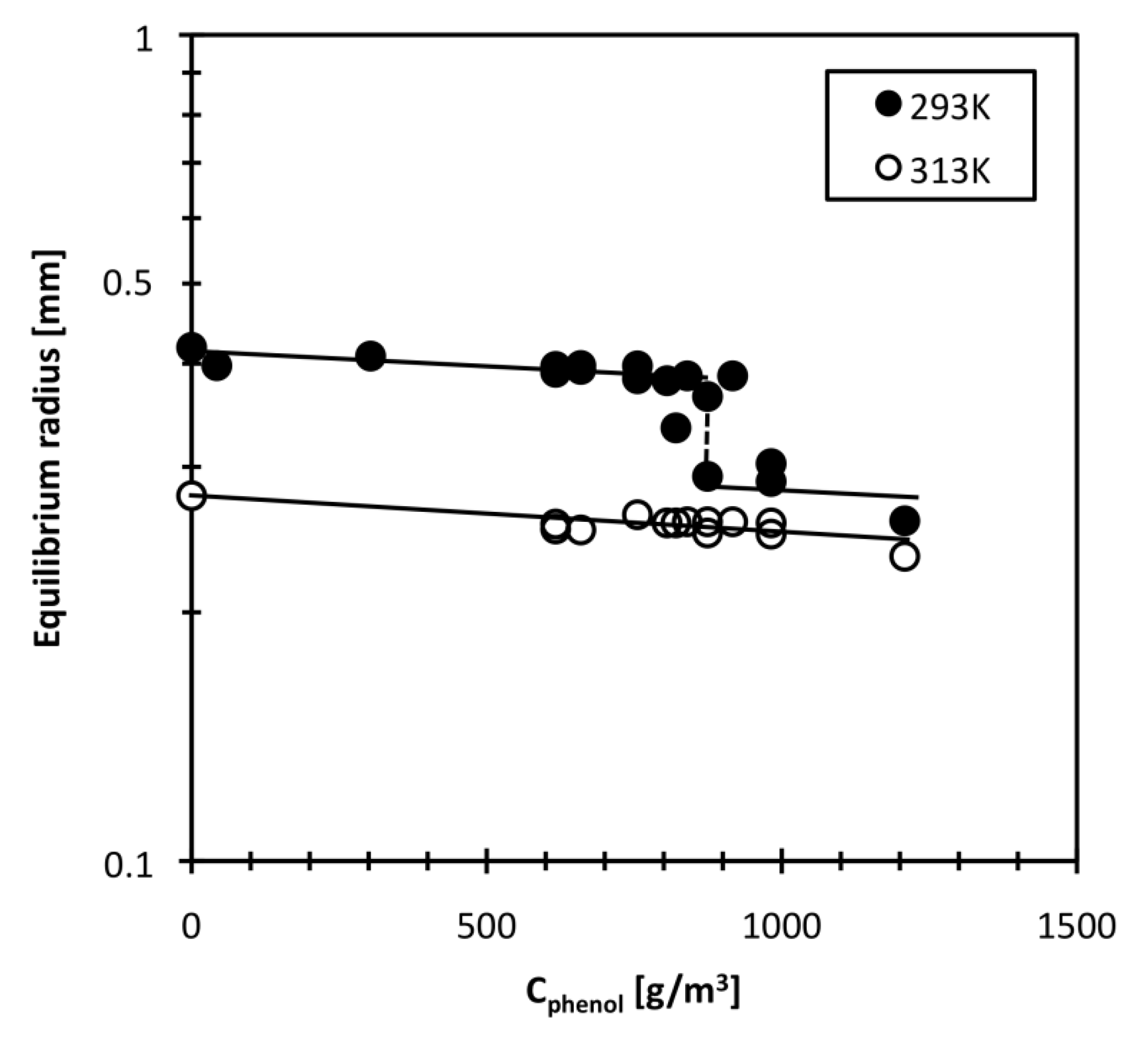 The equilibrium radius of the DEAA gel particle was measured at various bulk phenol concentrations. Figure 3 shows the equilibrium radius change with bulk phenol concentration. The equilibrium radius ae of this DEAA gel particle in pure water (0 g/m3 phenol) was 0.417 mm at 293 K. The ae value decreased slightly with increasing bulk phenol concentration, and was 0.381 mm at a bulk phenol concentration of 802 g/m3. Between 874 and 916 g/m3, the ae value was discontinuously changed. The ae was less than 0.3 mm at phenol concentrations above 950 g/m3. A discontinuous change in characteristic length of DEAA gel at a certain phenol concentration has also been observed at a different temperature in the literature [25]. The temperature induced volume phase transition of hydrogels depends on the solute concentration (NIPA-phenol system) [26] and that the phenol concentration required to induce the volume phase transition for DEAA gel is lower than that for NIPA gel [25]. Our results imply that the phenol concentration required to induce a volume phase transition at 293 K is about 874 g/m3 for the DEAA gel used in this study. At 313 K, changing the phenol concentration only causes a small change in ae. The DEAA gel remains in the shrunken state at 313 K. The reduction of the ae value with increasing the bulk phenol concentration is attributed to the increase in hydrophobic interactions caused by the adsorption of phenol molecules onto the DEAA gel network. High hydrophobic interaction of DEAA and phenol promotes the hydrogen bond formation between amide group of gel and the hydroxyl group of phenol, and subsequent the adsorption of phenol divests the amide group of hydrated water molecules [20,24]. We now know that hydrophobic pollution is capable of reducing hydrogel size in a chemical sensor. Furthermore, temperature sensitivity of DEAA gel is also changed because the phenol adsorption to DEAA gel lowers the transition temperature [20,25].