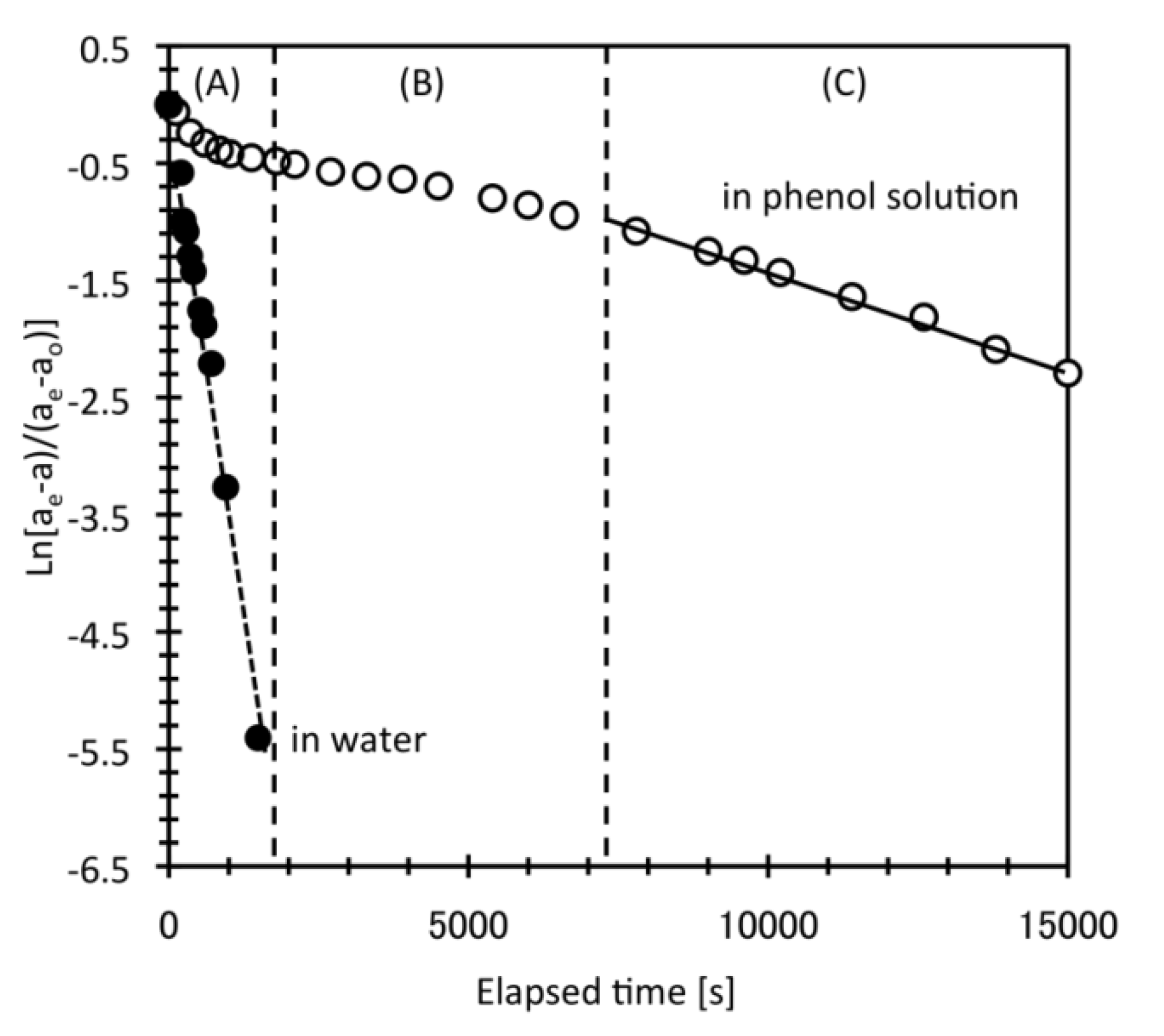 Figure 4 shows typical kinetic curves for the DEAA gel in phenol solution during the swelling process at 293 K. In phenol solution, the kinetic curve showed three distinct stages with different slopes. The entire kinetic curve in phenol solution, therefore, could not be fitted with Equation (1), although the kinetic curve data below 306 K corresponded approximately to the theoretical curve for swelling in water [21]. A linear approximation could be fitted to the later stages of the curve, 1–2 h after the start of swelling process (stage (C) in Figure 4). Both the phenol adsorption onto DEAA gel and desorption from the gel processes were almost finished within 2 h (data not shown). This time, range is very similar to the time of the change from stages (B) to (C) shown in Figure 4. The lack of fitting during the earlier stages suggests attributions of phenol adsorption-desorption process and subsequent polymer chain network relaxation during stages (A) and/or (B). The effect of hydrophobic pollution on hydrogel behavior changes with time.
