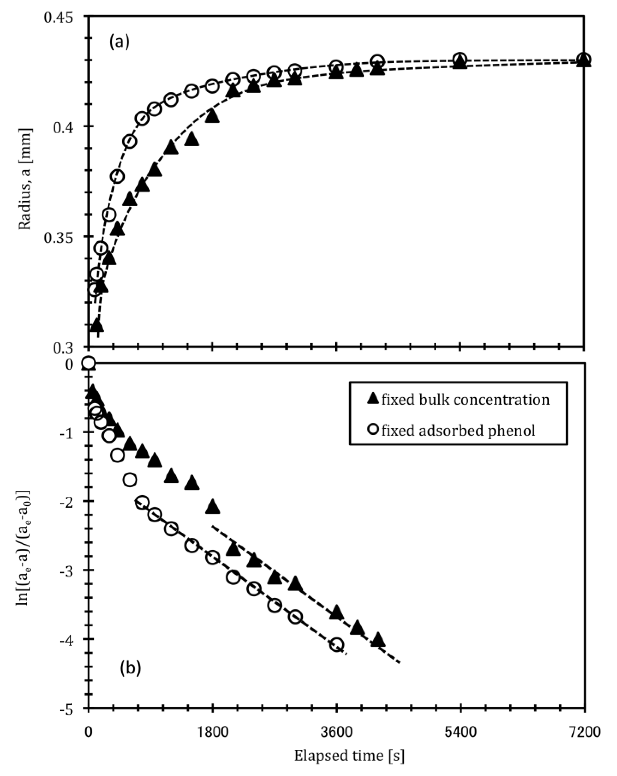 Figure 5 shows the radius change of a DEAA gel particle and kinetic curve for temperature swing from 313 K to 293 K under fixed qphenol condition. The data obtained with fixed bulk phenol concentration (Cphenol = 850 g/m3) were also plotted for comparison. The final DEAA gel radius under fixed qphenol condition finally reached same length as the radius obtained at phenol concentration of 850 g/m3 because the final amount of adsorbed phenol was the same for both fixed qphenol and fixed Cphenol conditions (Figure 5a). The initial amount of adsorbed phenol under fixed qphenol condition is lower than that under fixed Cphenol conditions as shown in Figure 1. During the initial stages, therefore, the DEAA gel radius under fixed qphenol condition was rapidly varied. The kinetic curve under fixed qphenol condition was a typical curve that could be described by the Tanaka and Fillmore theory [17,18], and consequently the linear approximation based on Equation (1) was successful (Figure 5b). This result implies that phenol was not eliminated from the DEAA gel and the polymer network decorated with fixed amount of adsorbed phenol apparently diffused. The slope of the approximately linear region obtained under fixed qphenol condition was very similar to the slope of the curve obtained under fixed Cphenol condition. This result is evidence that the polymer network decorated with fixed amount of phenol is undergoing collective diffusion in the later stage (C) of the curves obtained under fixed bulk phenol concentration and that the phenol adsorption-desorption process has finished before the start of stage (C). Phenol adsorption-desorption proceeds during the earlier stages of swelling, while the DEAA gel continues to swell after the phenol adsorption-desorption has reached a state of equilibrium. This is attributed to the slower kinetics of polymer network diffusion and relaxation compared with those of phenol adsorption.