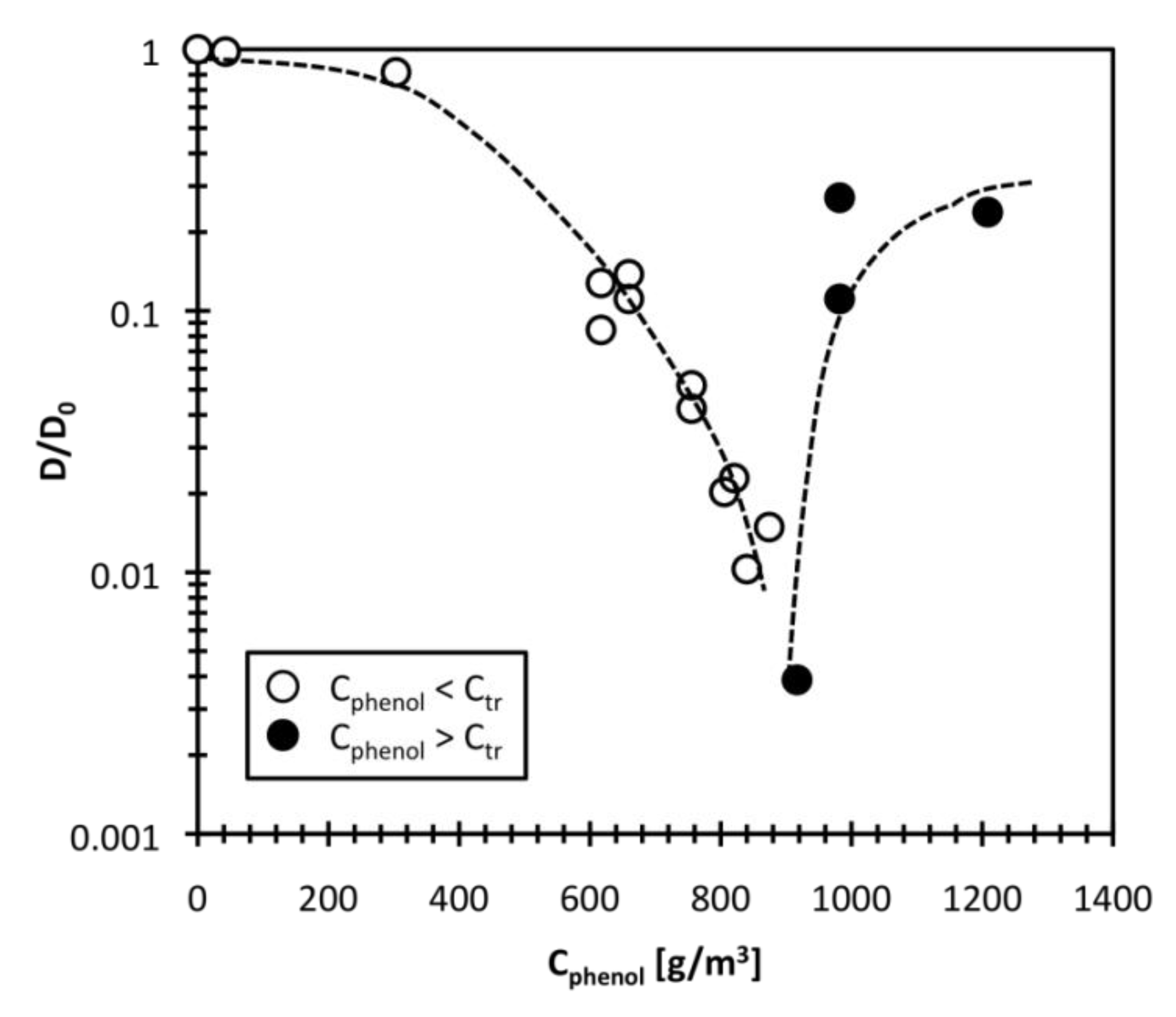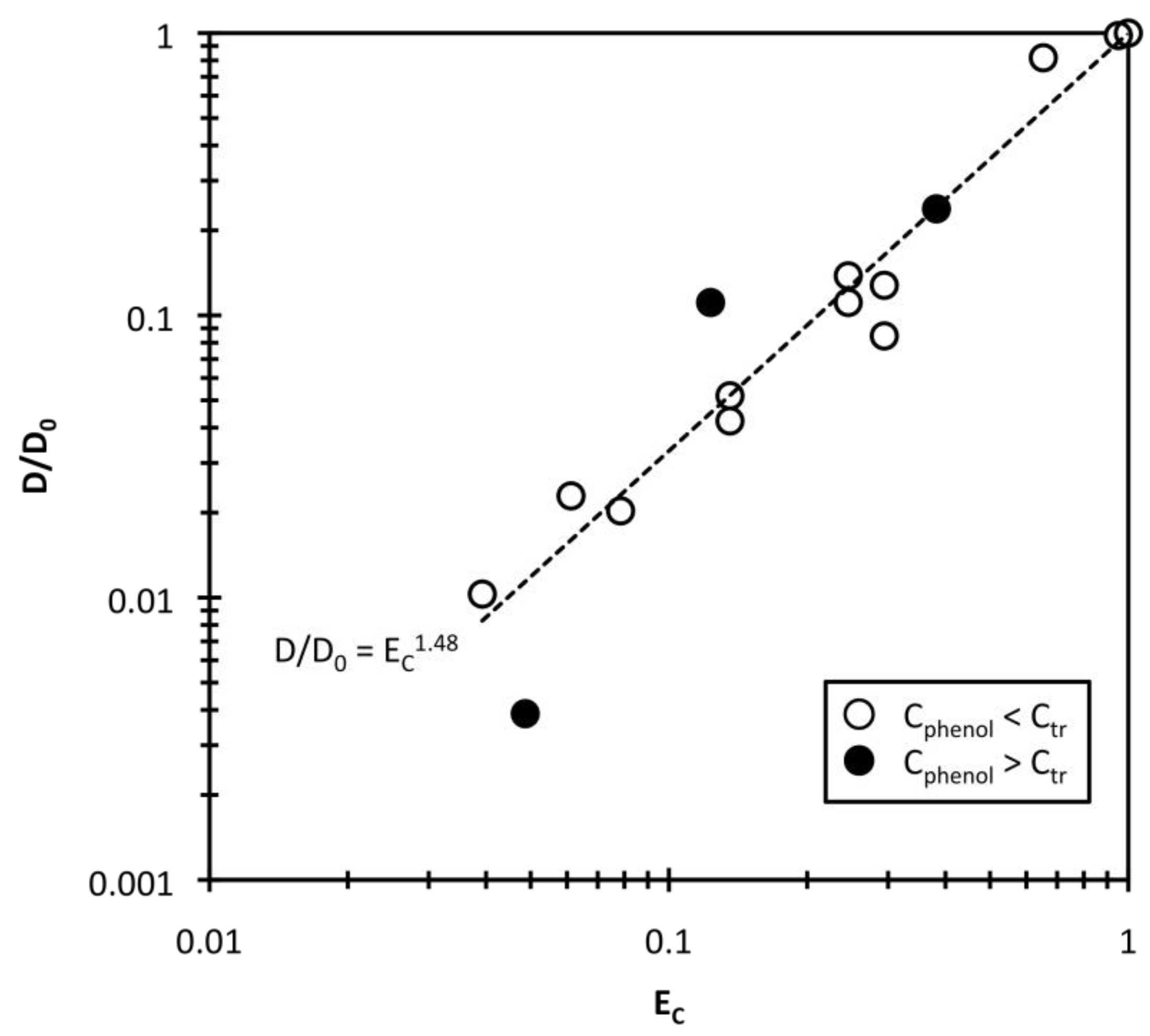 Therefore, the phenol concentration difference EC is also a function of qphenol. Assuming that Ctr = 874 g/m3, the diffusion constant ratio D/D0 was log-log plotted against EC in Figure 7. In principle, the D value may have to be normalized with the solution viscosity η to be able to examine the influence of mesh size, as shown in previous research [21]. In this study, the solution viscosity change with phenol concentration is negligible because the solution viscosity at low phenol concentrations (η) can be approximated as the water viscosity (η0) [27]. Therefore, the diffusion constant ratio D/D0 is equal to Dη/D0η0 and the effect of solution viscosity is eliminated. As shown in Figure 7, the D value depends strongly on EC, especially when Cphenol < Ctr (open circles). When Cphenol > Ctr, the D data may be scattered (closed circles) because the gel size change is very small and complicated. From the fitted curves, v = 1.48 for swelling. The collective polymer diffusion constant in phenol solution is correlated well with the phenol concentration difference based on the transition concentration, which indicates that the diffusion constant is mainly affected in phenol solution by the amount of adsorbed phenol and the mesh size of the polymer networks.
