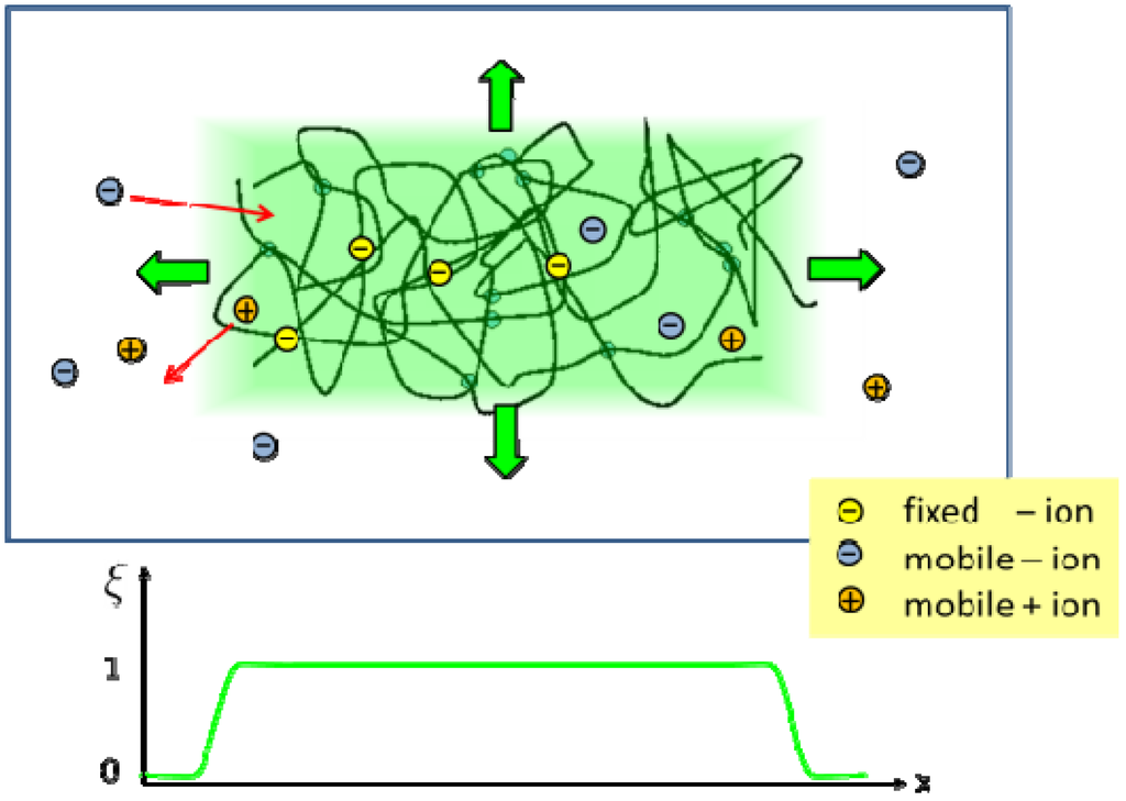 If the ion concentrations in the solvent are small, so that ϕs and ϕp are distinctly larger than the volume fractions of the mobile ions ϕk (k = 1,..., N), Equation (1) can be approximated by ϕp + ϕs = 1. Then, the volume fraction of water molecules is determined by the polymer volume fraction and does not have to be considered explicitly.
