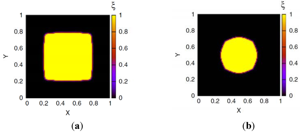 - Badalassi, V.; Ceniceros, H.; Banerjee, S. Computation of multiphase systems with phase field models. J. Comput. Phys. 2003, 190, 371–397. [Google Scholar] [CrossRef]