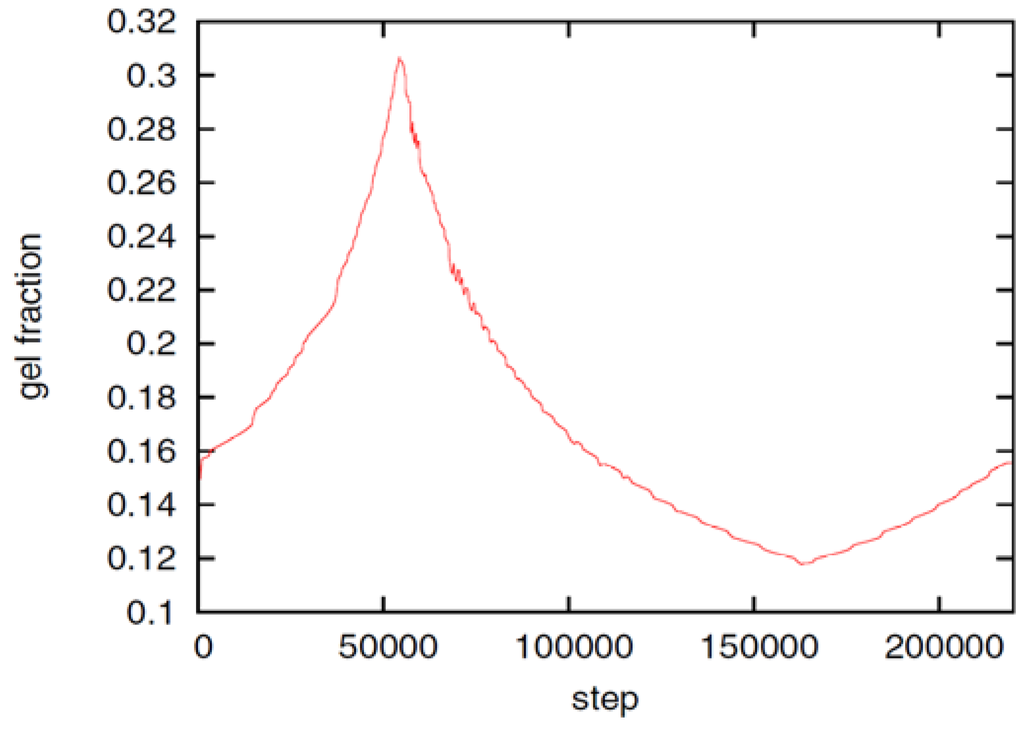 Figure 3 demonstrates the swelling, shrinking and swelling dynamics of the hydrogel as the boundary ion concentration is decreased to cbnd ≃ 0.108c* (time step 54,000), increased to cbnd ≃ 1.892c* (time step 163,500), and decreased again to the initial value. The gel fraction follows the changes of the boundary ion concentration with a short delay, which is too small to be visible in Figure 2 but has been investigated in the numerical study [20]. In general, the equilibrium gel volume is monotonously shrinking with increasing ion concentration in the bath. The result is in qualitative agreement with experiments, in which the pH is kept constant and the ion concentration is varied [35,77].
