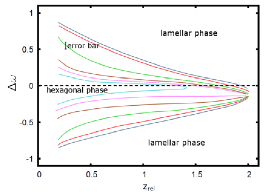 Setting wA + wB = 1, we use the crosslink strength z and the crosslink asymmetry ∆w ≡ wA − wB to specify the crosslink properties. For convenience, the crosslink strength is represented by the parameter zrel = zρ0/χ.