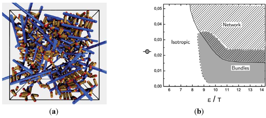 - Chelakkot, R.; Lipowsky, R.; Gruhn, T. Self-assembling network and bundle structures in systems of rods and crosslinkers – A Monte Carlo study. Soft Matter 2009, 5, 1504–1513. [Google Scholar] [CrossRef]
