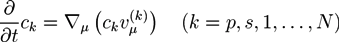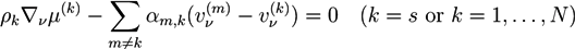 with chemical/electrochemical potentials μ(k). The mass densities ρk are given by ρk = mkck, where mk is the mass of a solvent molecule (k = s) or an ion (k = 1,…, N). The constants αm,k are friction coefficients between phases k and m. For the polymer phase, one has: