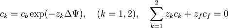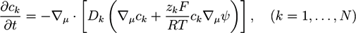 with the Faraday constant F ≃ 9.649 × 104Cmol−1, the gas constant R ≃ 8.314Jmol−1 K−1, and the temperature T. Ions of species k have diffusion constants Dk. The Nernst-Planck equation corresponds to the continuity equation Equation (2) under the assumption that the ion flow is determined by the concentration gradient and the electric potential