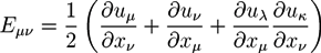 where Pμv and δμv are components of the full pressure tensor in the hydrogel region and the unit tensor, respectively. The coefficients λh and μh are the first and second Lamé coefficients of the hydrogel. The Green-Lagrangian strain tensor Eμv is given by: