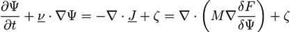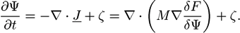 with a variational derivative δF/δΨ, and a mobility M, which, in general, may depend on Ψ. In a fluid polymer blend, Ψ is often taken as the concentration of one component and the bulk free energy density f(r) is the Margules activity from the Flory-Huggins theory [64,65]. In many cases, a Gaussian noise term ζ(r; t) is added to the Cahn-Hilliard equation so that the equation has a Langevin form: